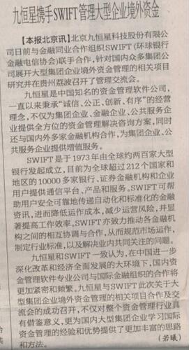 案例赏析—九恒星携手SWIFT管理大型企业境外资金(中华工商时报)