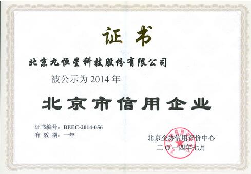 近期,北京九恒星科技股份有限公司被北京企业协会信用评价中心评为“2014年北京市信用企业”,这是对九恒星公司围绕以“诚信、公正、创新、有序”为核心的经营理念的充分肯定,也是对九恒星公司未来诚信经营和发展的一种鼓励和支持。