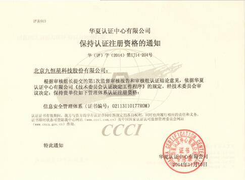 近日依据华夏认证有限公司《技术委员会认证决定工作程序》的规定,经技术委员会审议决定,保持北京九恒星科技股份有限公司信息安全管理体系的资格且证明。此举说明九恒星公司信息安全的能力继续得到了社会的认可。