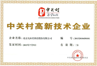 北京九恒星科技股份有限公司近日再次获得了由中关村科技园区管委会颁发的“中关村高新技术企业”证书。获得该证书后,九恒星将能够参与中关村科技园区举行的各类重大活动,可以与园区内企业进行各种形式的技术交流,同时还将享受中关村科技园区对于高新企业的诸多优惠政策。