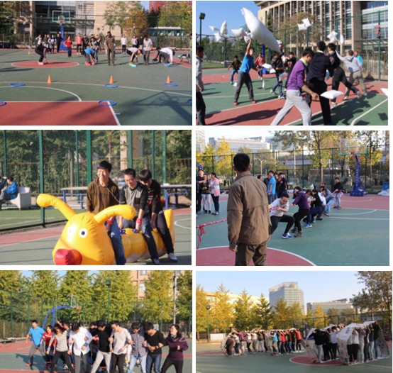 “指压板挑战”、“枕头大战”、“智勇闯关”、“毛毛虫竞技”、“蛟龙出海”、“无敌风火轮”…… 一系列充满挑战竞技的比赛,充分挖掘了队员自身潜力、磨练了意志、坚定了信念、加强了沟通。比如“指压板挑战”,要求每个队员必须脱掉鞋在有磨脚的小凸起的硬质塑板上采用队员接力的方式完成一系列运动项目的挑战,拼速度、拼毅力、拼技巧、拼团队协作,各队的队员咬着牙、忍着“疼痛”、齐心协力、过关斩将,争夺第一。加油助威声、尖叫声、欢呼声此起彼伏,回荡整个体育场上空……整个比赛过程中,各队队员互帮互助,团结一致,完美的诠释了“团结就是力量”的真谛。