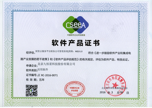 3月底,九恒星“财资云服务平台财务公司管理系统[简称:N9]”获得由中国软件企业评估联盟、北京软件和信息服务业协会授予的《软件产品证书》。经评估,“N9”产品,符合《进一步鼓励软件产业和集成电路产业发展的若干政策》和《软件产品评估规范》的有关规定,顺利取得《软件产品证书》。