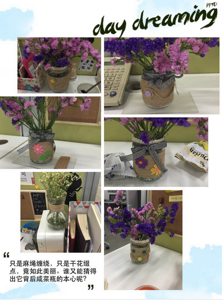比起其他工位,晓静组的装饰物似乎多出许多,可是却并没有超出限定的预算,“因为我们精打细算,以批发的价格买来这些小物件,并且充分考虑了桌面的有限空间,所以在两个工位之间做一个装饰,既美观又节省空间还省钱,就算将来离开了,新来的员工也可以欣赏到我们的成果,给他们带去快乐”,前人栽树后人乘凉,这一席话不仅让我们看到了她们小组为活动做出的精心准备与努力,更看到了她们身上令人不禁赞叹的善良与温情,加油姑娘们!