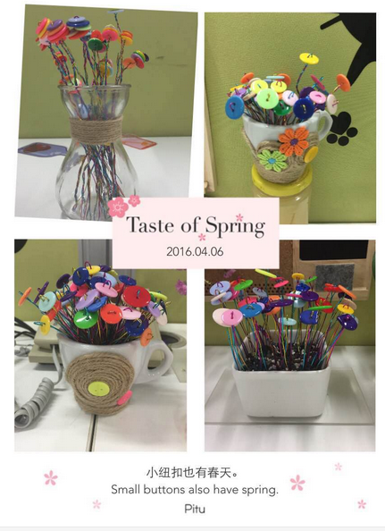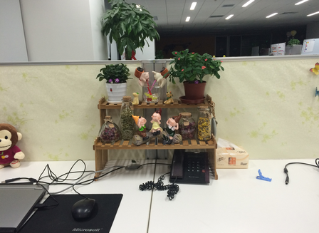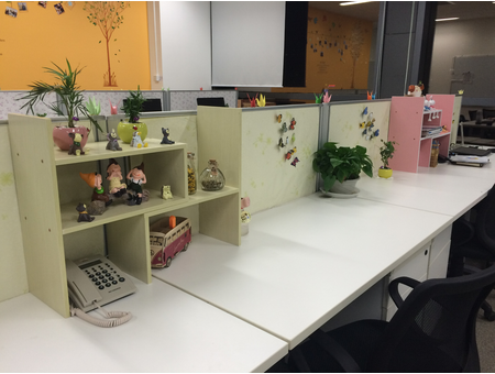早在比赛开始的第一周,她们组的作品就已经吸引了很多人的眼球,姑娘们的准备精心又完美,绿色的盆栽、鲜艳的小花、可爱的玩具、整齐的格子架,全部由她们利用中午休息及下班时间,亲手组装与布置,问到为什么选择这样布置,冯晓静颇有专业艺术家的独特审美“这样布置不仅拓展了桌面的立体空间,突出了层次感,并且美化了我们的工位,清新空气之余,还放松了心情,可谓一举多功”。