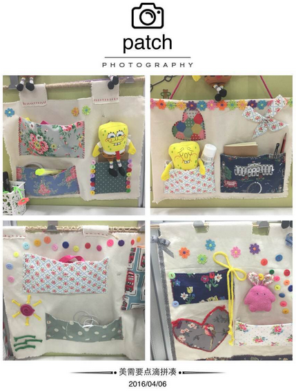 她们的作品均是废物再利用,纯手工打造:麻绳缠绕的图案,纽扣装饰的花簇,布片缝制的简易挂袋,还有鞋盒改装的精美纸抽……