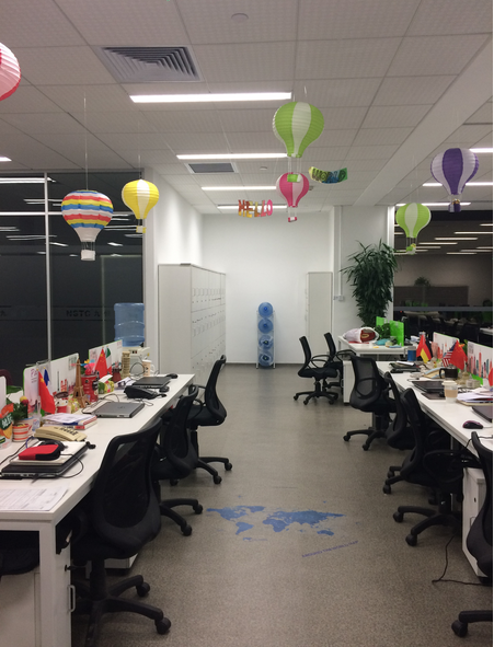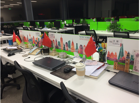 王璇介绍到,“ hello world”主要靠三个部分体现,在仅有的工位区间,局限的布置环境中,充分利用天花板、桌面、地板这三大空间,打造他们组心中的world:天花板上九个彩色热气球,象征九恒星,乘坐其中遨游世界;桌面世界著名建筑背景墙剪影贴及手工拼做的各国地标性建筑模型、国旗,象征鼓舞成员将业务拓展全球;地板上的世界地图,则象征大家要“踏遍”全世界。整体看来,“ hello world”组工位设计不仅新颖独特、不走寻常路,更是立意深远、满载希望!亚军的荣归,你们受之无愧!