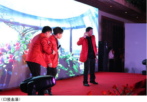 随着夜幕的降临,2013年联欢晚会拉开了序幕,由北京总部,分/子公司,各办事处、以及实习生组成的各自团队自编自演了许多丰富多彩,妙趣横生的节目,公司还邀请了中央电视台主持人周波小姐担任联欢晚会主持人,并邀请了来自全国各地的表演达人们为此次年度联欢晚会添枝加叶。