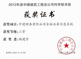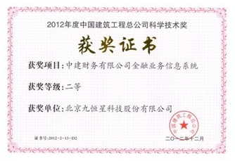 近日,中建集团将中建财务有限公司与北京九恒星科技股份有限公司合作开发的资金管理系统作为双方共同的财产申请了著作权,并向九恒星公司及九恒星公司董事、副总经理陶建宇先生个人分别授予了中建系统内部(等同于建筑行业,是建设部授权的奖项)科学技术奖。