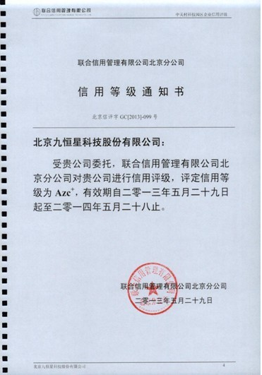 作为国内资金管理软件领域的领导品牌,九恒星一直专注于在专业资金管理软件领域的发展,并且在市场业绩、企业资信、用户口碑等方面得到了广泛的提升,与此同时,九恒星的发展前景也得到了相关评级机构的认可。近期,在联合信用管理有限公司针对中关村科技园区企业信用评级报告中,九恒星继2012年后,今年再次被评定为Azc+级信用评级,体现了九恒星过去一年里在公司规模、资信水平、发展前景等方面的突飞猛进。