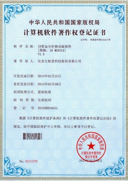 根据《计算机软件保护条例》和《计算机软件著作权登记办法》规定,经中国版权保护中心审核,九恒星I8资金分析移动版产品正式获得中华人民共和国国家版权局颁发的计算机软件著作权登记证书。九恒星亦成为国内首个在移动终端设备上开发资金分析管理软件的公司。