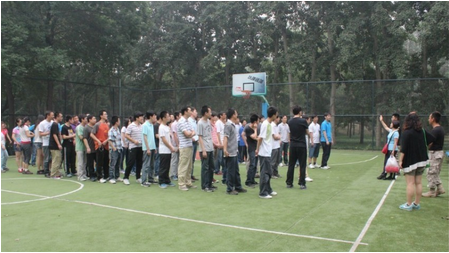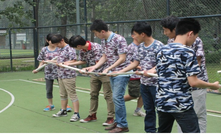 第一组首先参加素质拓展比赛,比赛内容包括障碍接力比赛和拔河比赛,障碍接力赛中有包括要求团队用手组成通道让小球通过等这样的小环节,都非常需要团队成员之间的密切配合。