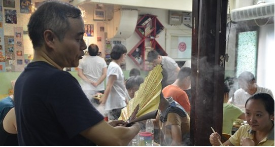 就餐期间,同事们除了谈论8号苑的鲜明特色及其食物的美味,也不忘各种逗趣,因为吃的很是热火朝天,很多同事都大汗淋漓,不过这难不倒我们的同事,有人祭出了“法宝”扇子并且到处互动,引发大笑连连。