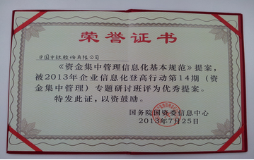 九恒星“中国中铁股份有限公司资金集中管理信息化基本规范提案”获国务院国资委优秀提案奖