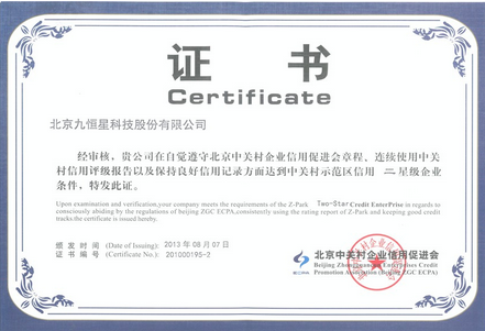 2013年8月7日,北京九恒星科技股份有限公司荣膺了由中关村企业信用促进会评估、认定并颁发的中关村示范区信用二星级企业证书。