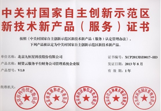 2013年8月,经北京市发展和改革、科学技术、经济和信息化等相关委员会批准,九恒星“财资云服务平台财务公司管理系统企业版V1.0”,按照《中关村国家自主创新示范区新技术新产品(服务)认定管理办法》被认定为中关村国家自主创新示范区新技术新产品*服务)。
