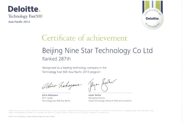 九恒星再次荣膺2013年德勤高科技、高成长亚太地区500强