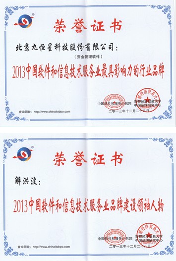 2013年12月29日,由中国软件和服务外包网、首都经济贸易大学中国品牌研究中心、黄山经济开发区管理委员会联手合作,以“品牌提升产业”为主题的“2013第二届中国软件和信息技术服务业品牌大会”在黄山顺利举办,并取得圆满成功。来自全国各地软件和信息技术服务产业精英企业代表齐聚一堂。九恒星董事、信息管理总监郭吉宏先生受邀参加了此次大会。会上,北京九恒星科技股份有限公司被评选为最具影响力的行业品牌,公司董事长解洪波荣获品牌建设领袖人物奖。