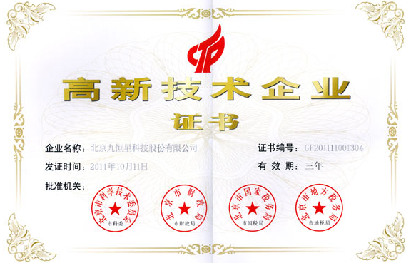 九恒星继2008年被有关方面核准为高新技术企业后,于近期再次被北京市科学技术委员会、北京市财政局、北京市国家税务局、北京市地方税务局核准为高新技术企业,获高新技术企业证书。