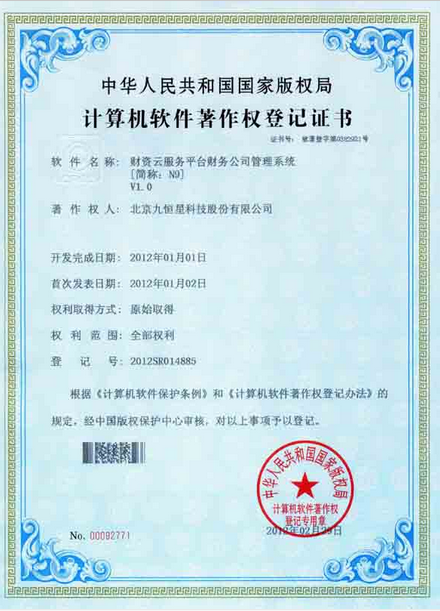 九恒星财资云服务平台财务公司管理系统V1.0近日获软件著作权登记
