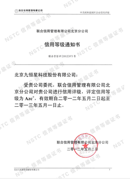 近期,在联合信用管理有限公司针对中关村科技园区企业信用评级报告中,九恒星被评定为Azc+级信用评级,从2011年Azc-级信用评级,到2012年的Azc+级信用评级,更体现了九恒星在公司规模、资信水平、发展前景等方面更全面的提升。联合信用管理有限公司对九恒星的评级结果显示,软件行业是政府鼓励发展的行业具有巨大的发展潜力,九恒星一直专注于资金管理软件行业的发展具有较强的专业性,公司规模较大,知名度高,与其他主要竞争对手相比具有较强的竞争力,在未来一年中的发展前景较好。