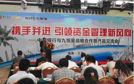 2012年6月19日,由中国银行总行和北京九恒星科技股份有限公司联合主办的“携手并进 引领资金管理新风向、中国银行与九恒星战略合作暨产品交流会”在美丽的海岛三亚顺利开幕。会议邀请了中国银行领导、九恒星领导及50多家企业财务负责人参加。