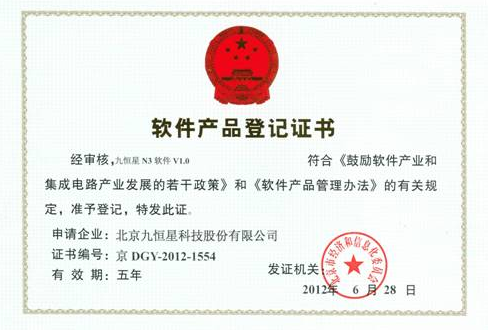 近日,通过北京经济和信息化委员会审核,九恒星N3软件V1.0产品符合《鼓励软件产业和集成电路产业发展的若干政策》和《软件产品管理办法》的有关规定,获准登记软件产品证书。
