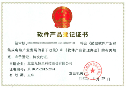 近日,由北京九恒星科技股份有限公司申报的九恒星智能资金平台集团金融管理系统(N6)标准版软件V2.2最终通过北京经济和信息化委员会审核,产品符合《鼓励软件产业和集成电路产业发展的若干政策》和《软件产品管理办法》的有关规定,获准登记软件产品证书。