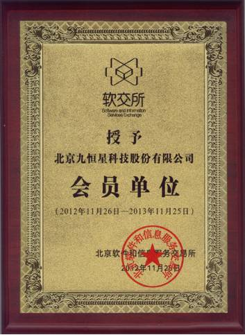 2012年11月26日,通过北京软件和信息服务交易所专业测评、严格审核,北京九恒星科技股份有限公司被授予会员单位荣誉头衔。