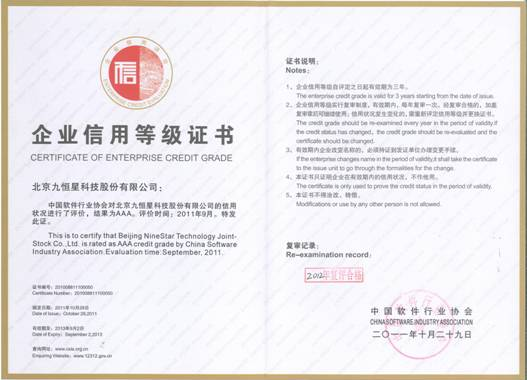 2011年10月29日,北京九恒星科技股份有限公司通过中国软件行业协会AAA信用评价,荣获由中国软件行业协会颁发的“企业信用评价AAA级信用企业”证书。2012年,经过严格考察,九恒星顺利通过复评审核,蝉联“AAA级信用企业”称号。