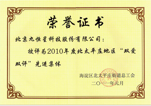 九恒星工会从成立至今,通过努力的工作,调动了员工的积极性,形成了企业内部和谐向上的人际关系,凭借出色的工作成绩,在海淀区北太平庄街道总工会组织推荐并评选的“双优双评”活动中荣获2010年度北太平庄地区“双优双评”先进集体荣誉称号。
