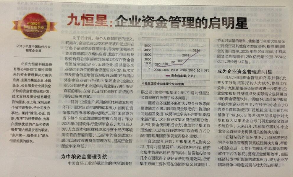 2013年度中国软件行业领军企业奖—企业资金管理的启明星(中国计算机报)