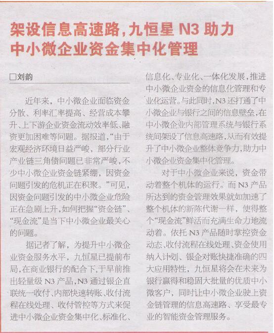 案例赏析—架设信息高速路,九恒星N3助力中小微企业资金集中化管理(商务时报)