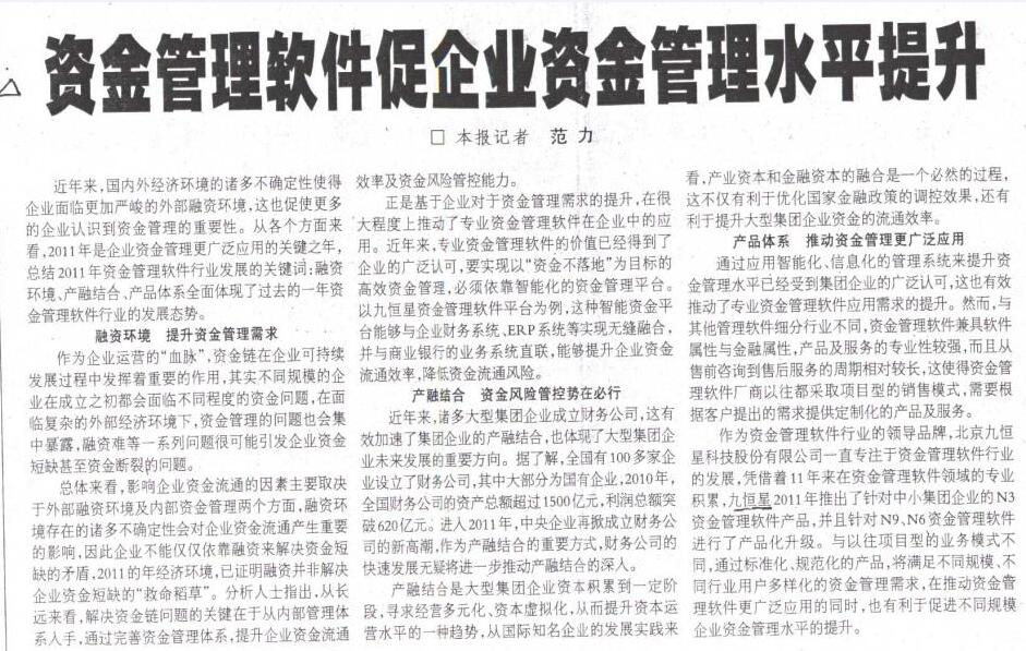 《资金管理软件促企业资金管理水平提升》--《科技日报》