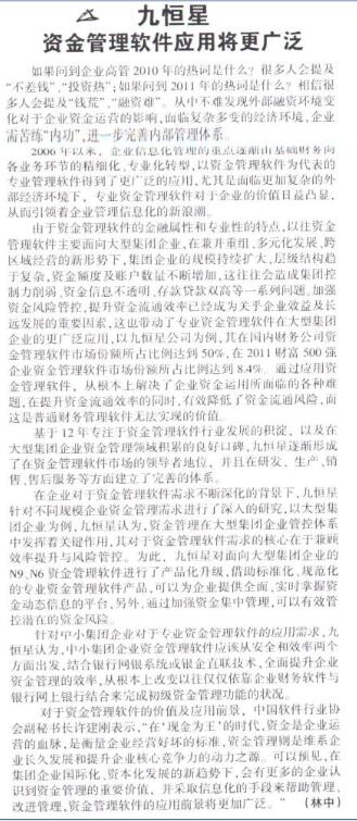 《九恒星资金管理软件应用将更广泛》--《亚太经济时报》、《中国贸易报》