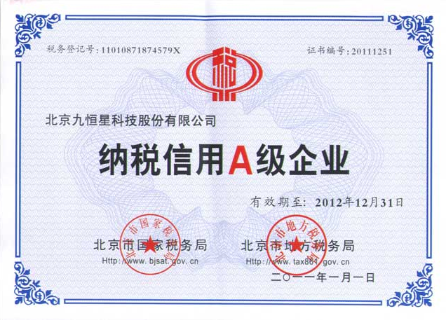 在北京市国家税务局、北京市地方税务局评选的2011年至2012年度“纳税信用A级企业”活动中,九恒星被授予2011年度“纳税信用A级企业”证书和铜牌。