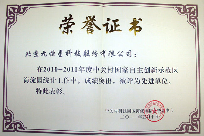 在2010-2011年度中关村国家自主创新示范区海淀园统计工作中,北京九恒星科技股份有限公司因统计数据真实、准确、完整、及时,于5月11日被中关村科技园区海淀园信息统计中心评为先进单位。
