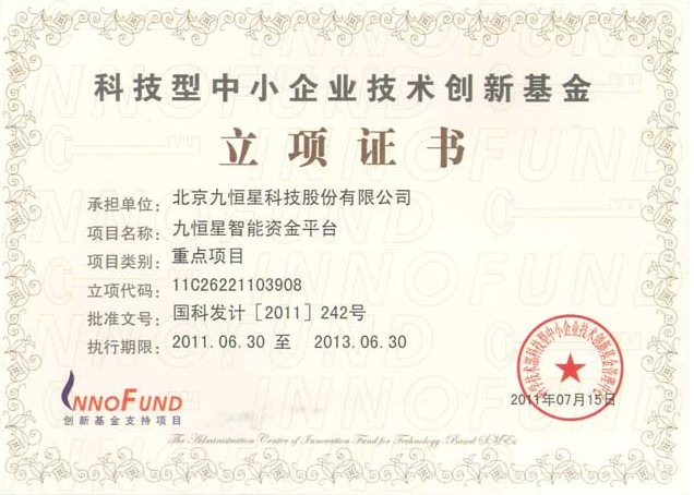 “九恒星智能资金平台”近日获创新基金立项证书,九恒星把科技创新作为加快公司发展、更好服务客户的巩固基础管理之根本,多年来完善的用人制度、人才奖励机制,确立了“突破创新、固本强基”的总体科技发展思路,一批批“火炬计划”、“高新成果认定”、“自主创新产品”、“创新基金项目立项”成果在科技人才的努力下应运而生,使科技创新不断收获精彩,为公司的可持续发展提供了动力。