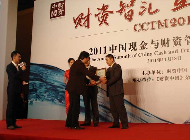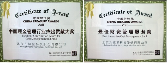 2011年11月18日由财资中国主办的“2011年中国现金与财资管理高峰年会”在北京万豪酒店隆重举行。本次高峰年会以“财资智汇,互联互通”为主题,邀请了来自政府部委和行业协会领导,企业经营和财资管理高层,以及第三方现金管理与财资服务机构的高层等约200位财资领域的精英共同与会。作为中国资金管理软件行业的领导者,九恒星荣膺“中国现金管理行业杰出贡献大奖”和“最佳财资管理服务商”两项大奖。