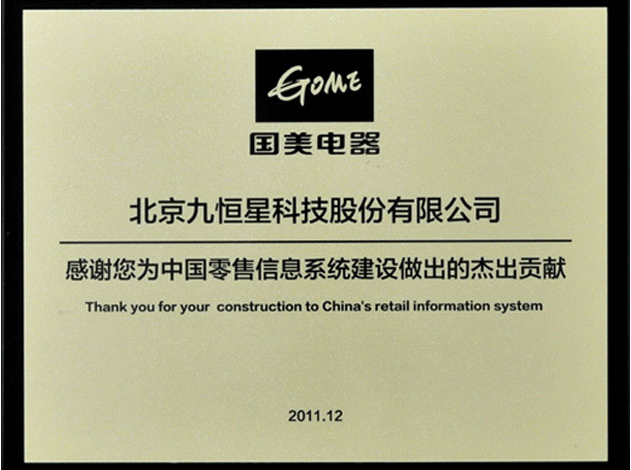 12月1日,在天津召开的国美领航者ERP信息系统实施成功发布会上,国美电器总裁王俊洲正式宣布国美领航者ERP信息系统实施成功。而作为国内资金管理软件行业的领导者,九恒星提供的专业资金管理软件在该系统中得到成功应用,并且受到客户方面的高度认可,对此国美电器颁发牌匾以感谢九恒星为中国零售信息系统建设所作出的贡献。