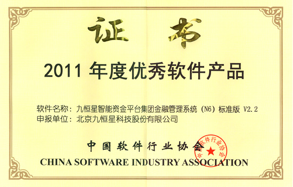 在中国软件行业协会举办的2011年度软件产品推优活动中,九恒星所申报的“智能资金平台集团金融管理系统(N6)标准版”产品经过了企业申报、技术资料审核、专家评审等程序,最终荣获由中国软件行业协会颁发的“2011年度优秀软件产品”称号,这也是九恒星智能资金平台产品连续第12年获得此项荣誉。