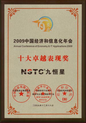 在12月18日由中国信息化推进联盟、中国软件行业协会财务及企业管理软件分会主办、“ENI经济和信息化”承办的“2009中国经济和信息化年会(第六届百交会)”上,九恒星荣幸地获得年会主题奖项“2009年度十大卓越表现奖”,年会对此给予的评语为“表彰那些在过去的一年里,克服金融危机的重重障碍,获得飞速发展的软件企业,他们的成功经验让我们看到了未来快速成长的中国创新企业的美好前景”。