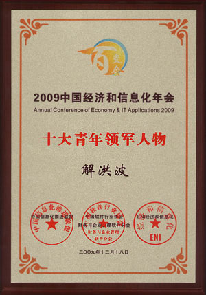 在年会上九恒星公司董事长兼总经理解洪波先生同时获得了“2009年度十大青年领军人物”个人奖项。