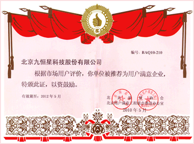 九恒星公司日前获得北京质量协会、北京用户满意工程联合推进办公室评选的“用户满意企业”荣誉
