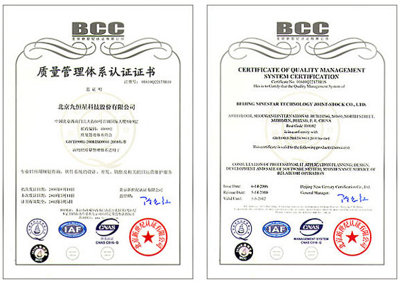 九恒星近日顺利通过ISO质量管理体系定期监督审核,获得ISO9001:2008质量管理体系认证证书。
