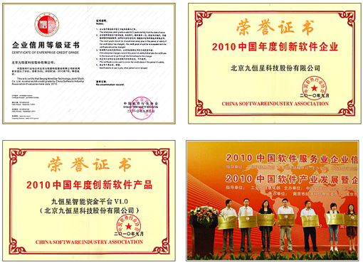在此次发布会上,九恒星凭借日益增强的企业实力、抗风险能力以及良好的资信状况,荣获“企业信用AA等级证书”;在同时举行的“2010中国软件产业发展暨企业创新高峰会”上,九恒星携旗下新产品“智能资金平台V1.0”还分别荣获“2010中国年度创新软件企业”和“2010中国年度创新软件产品”。这些荣誉的获得体现了九恒星持之以恒和持续发展的“诚信、公正、创新、有序”的经营理念。