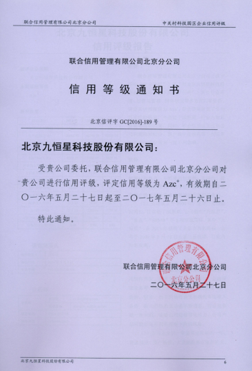 据悉,北京九恒星科技股份有限公司继2015年后,再次通过了由联合信用管理公司实施的信用评级程序,获得了Azc+ 级信用评定,此次评定的有效期为一年。