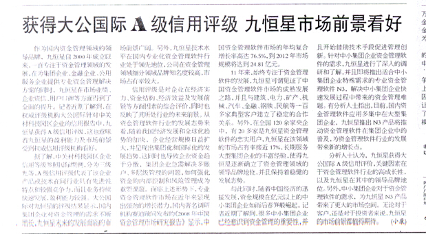 案例赏析—获得打工国际A级信用评级 九恒星市场前景好看(亚太经济时报)