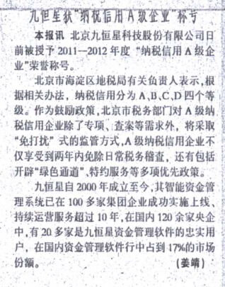 案例赏析—九恒星获“纳税信用A级企业”称号(科技日报)
