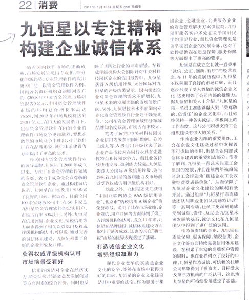 案例赏析—九恒星以专注精神构建企业诚信体系(上海商报)