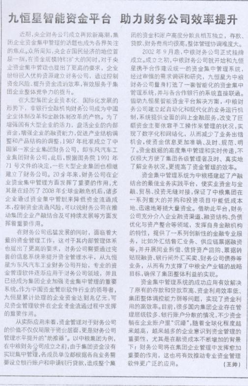 案例赏析—九恒星智能资金平台 助力财务公司效率提升(中国产经新闻)